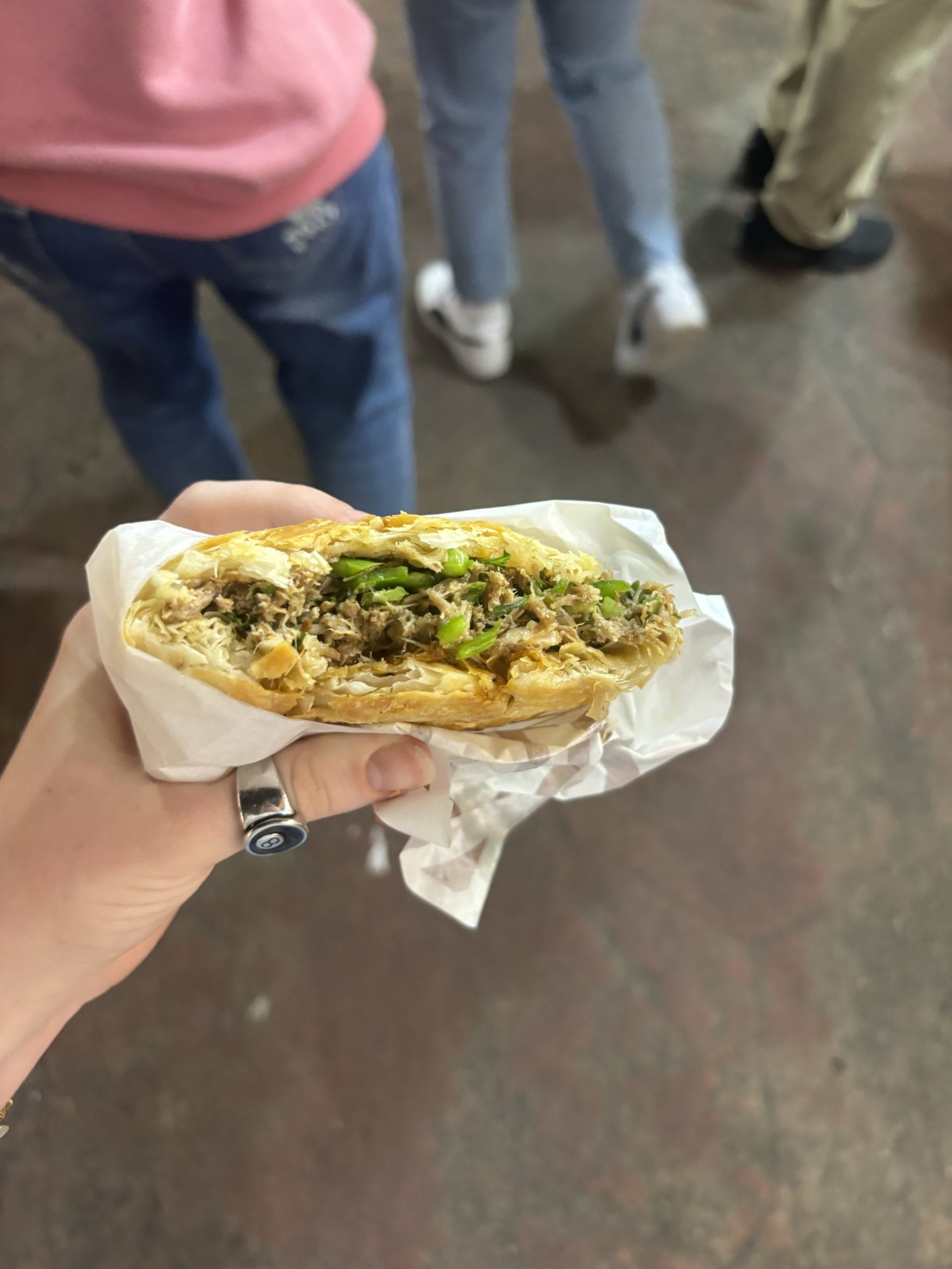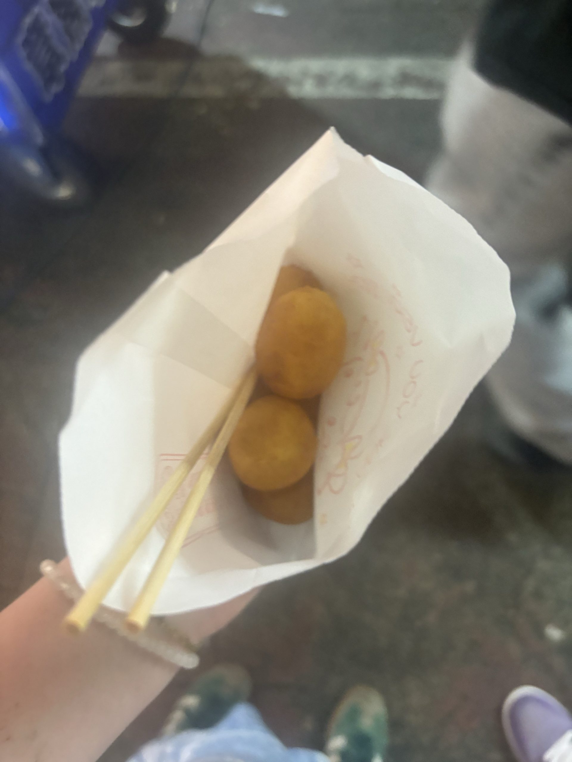 With so many options, the first thing we ate was Rou Jia Mo. also called a Chinese hamburger, it had a crispy flakey bun and was filled with pork onions and chili oil. Then we got deep fried sweet potato balls which the students we met at our partner school today recommended. They were so good! They have topping options but decided to get the original.